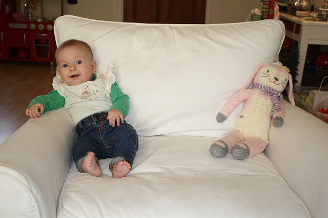 Eleanor is five months old today. Hard to believe it! She is a joy to parent. A complete angel baby. Yes, she has her moments, but that's all they are - moments. For the majority of the time she is just a hang out and chill baby. I was telling Josh today that she is so content just sitting and watching us. No need for a toy; no need to be entertained; she just likes to be around us and watch us live our lives... it's awesome. She, just like her sister, loves her pacifier and today was able to grasp it and bring it to her mouth! Quite the accomplishment for this little one. She's also been ravenous with her eating so today we gave cereal a try. She probably ate around 1/4 of what we put in her mouth, but it's a start! Ruby is still the pro-big sister. Seriously so amazing to watch. She's so encouraging with her, so loving, so sweet. And Eleanor reciprocates with the biggest, gummiest smiles. We love her so so much!